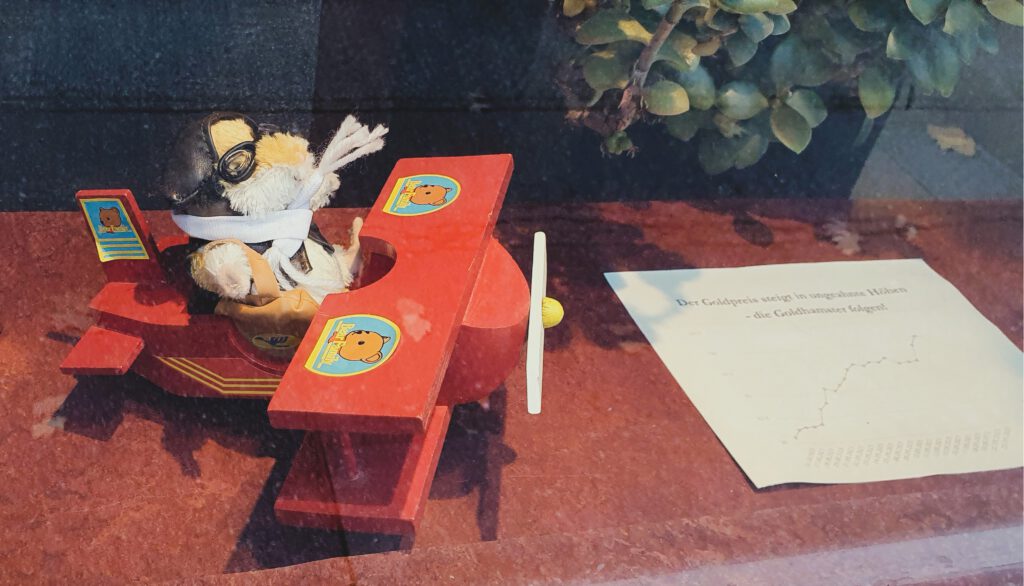 Unsere Schaufenster-Hamster haben eine große Fangemeinde bei Groß und Klein und werden oft fotografiert. Viele wissen gar nicht, was das mit den Hamstern soll: es sind natürlich Goldhamster !